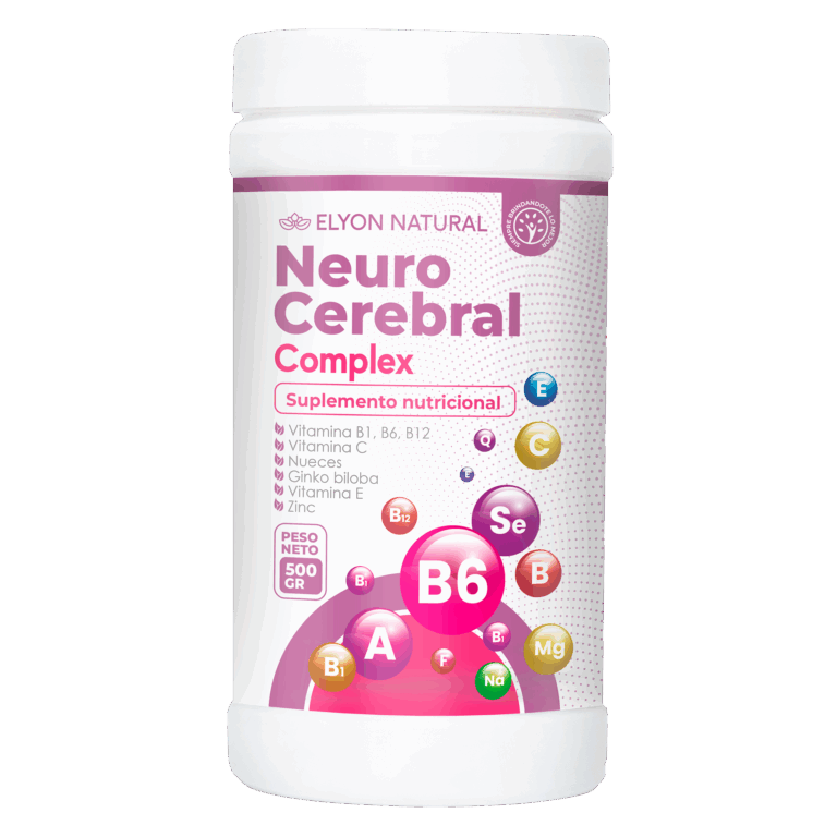 Neurocerebral Complex Elyon 500g combina Vitaminas del complejo B, C, E, Zinc, Ginkgo biloba y extracto de nueces para potenciar la memoria, concentración y energía mental.