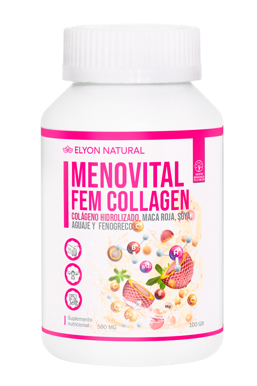 Menovital Fem Collagen es el suplemento natural definitivo para la mujer en menopausia o con desequilibrio hormonal. Nuestra fórmula única con Colágeno Hidrolizado, Maca Roja, Aguaje, Soya y Fenogreco ayuda a aliviar los sofocos, regular los cambios de humor y mejorar la energía y la salud de la piel. ¡Recupera tu bienestar femenino de forma natural!
